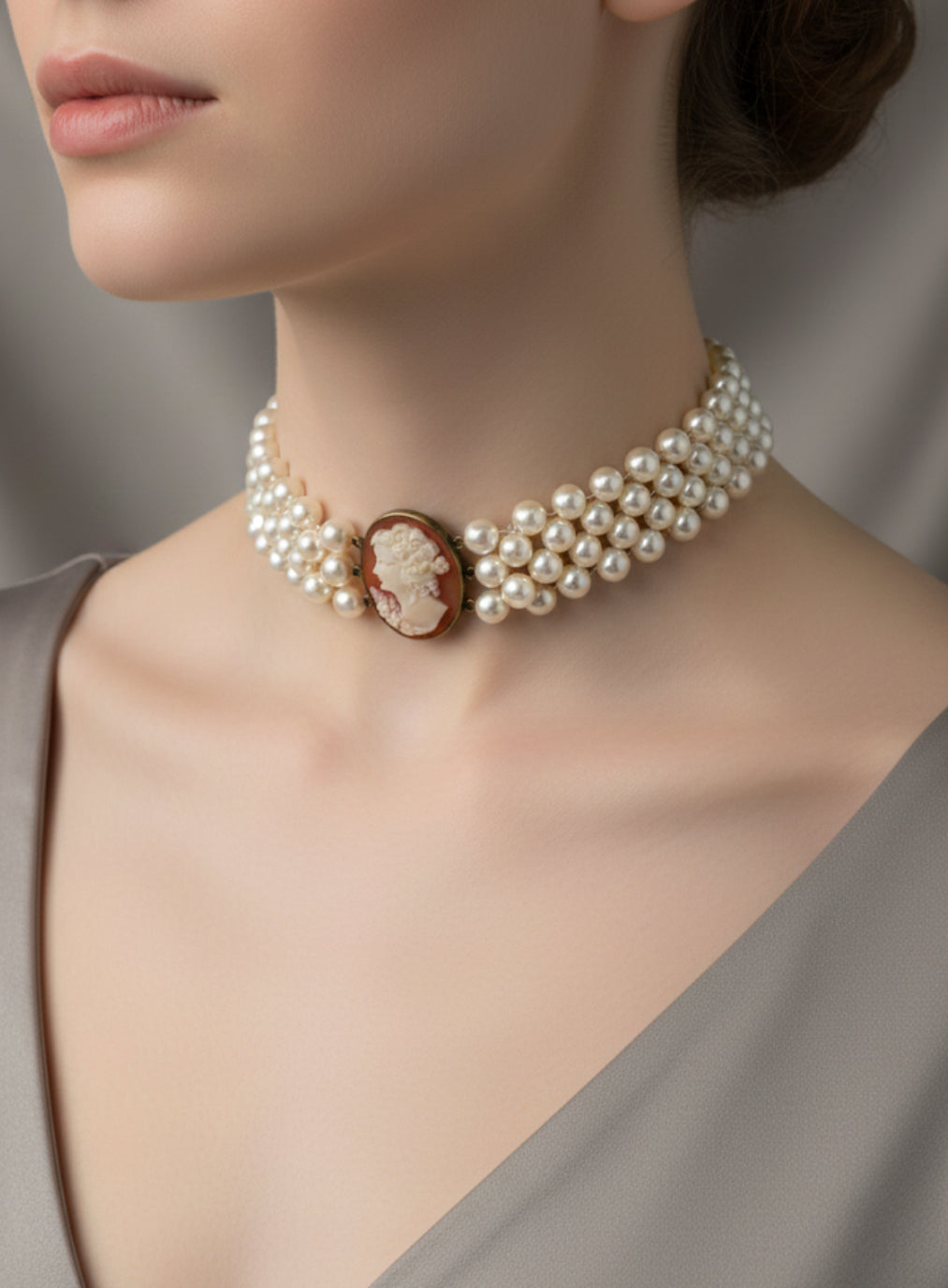 Girocollo in Perle e Cammeo incisione "Profilo di Donna"